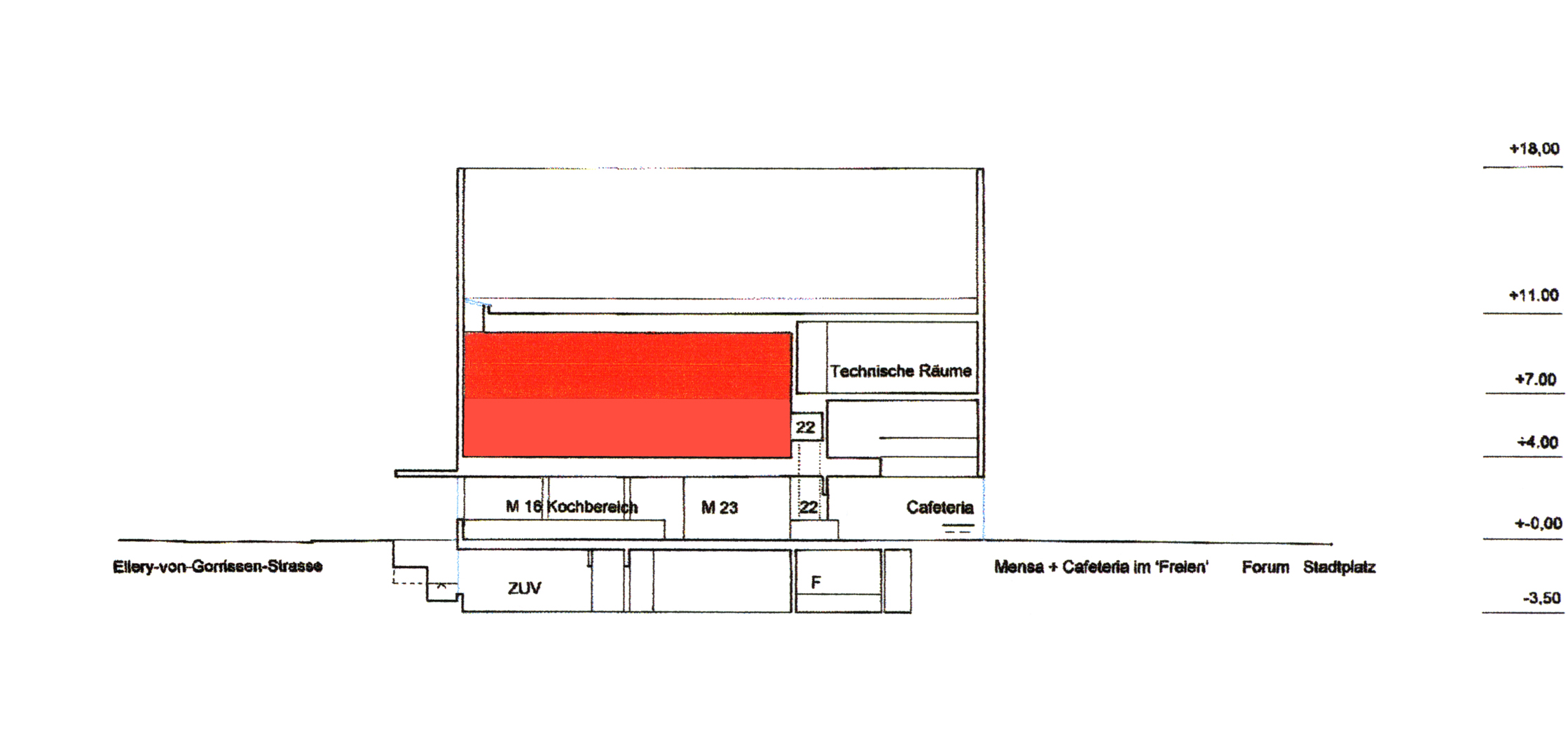Querschnitt – Kochbereich, Halle/Cafeteria, Forum-/Stadtplatz im Erdgeschoss – Speisesaal im 1. Obergeschoss